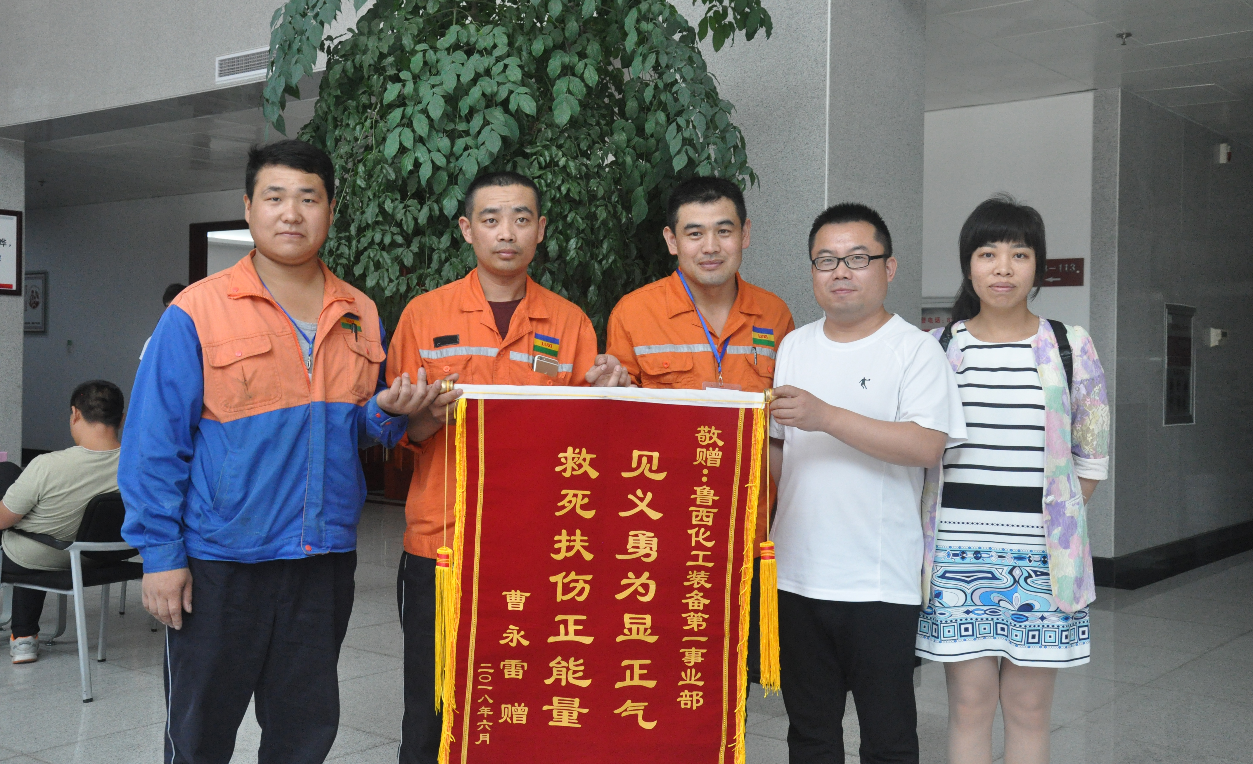 6月15日上午10點(diǎn),家住東阿的曹永雷先生在妻子及東阿縣人社局領(lǐng)導(dǎo)的陪同下,將一面寫有“見(jiàn)義勇為顯正氣 救死扶傷正能量”的錦旗送至魯西集團(tuán),要感謝前段時(shí)間自己在遭遇車禍生命垂危時(shí)出手相助的第一工程事業(yè)部員工張修振、劉召浩、齊玉祥三位好心人。“如果當(dāng)時(shí)沒(méi)有魯西集團(tuán)三位員工的熱心相助,真不知道會(huì)有多么嚴(yán)重的后果!真是太感謝你們了!”曹先生激動(dòng)地說(shuō)。