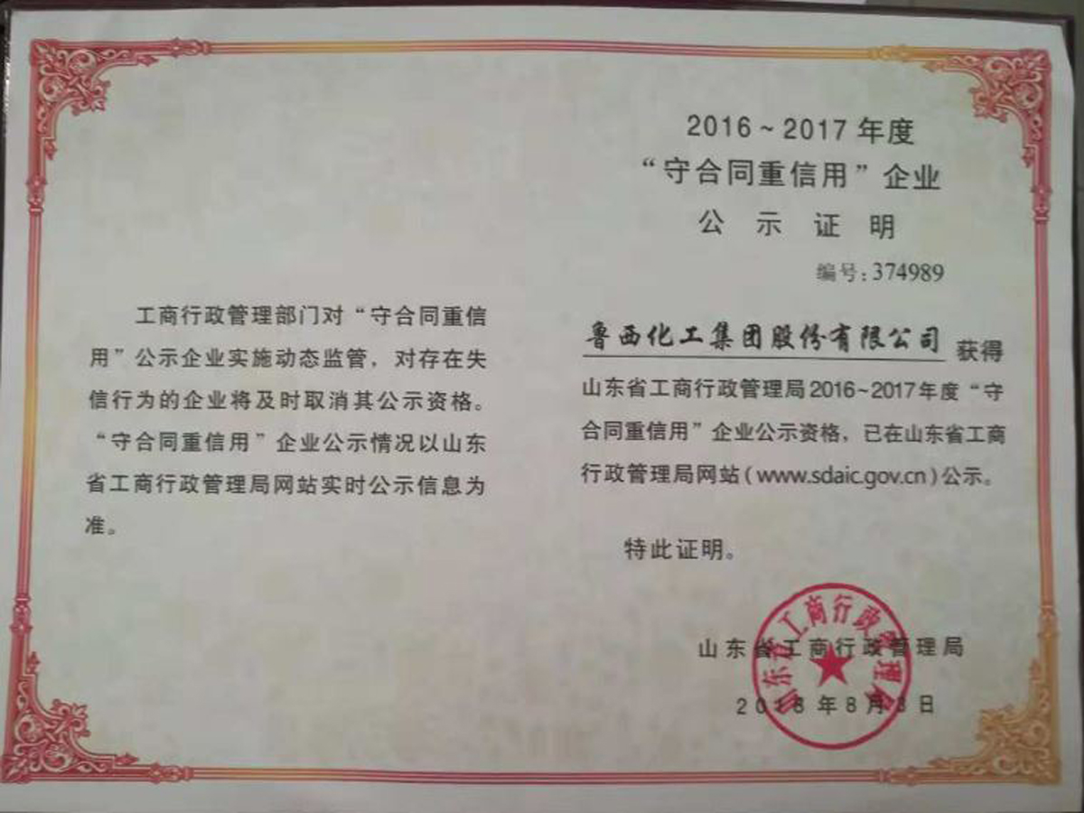 10月9日,魯西化工集團(tuán)股份有限公司收到了山東省工商行政管理局頒發(fā)的“2016-2017年度守合同重信用”的表彰證書。
