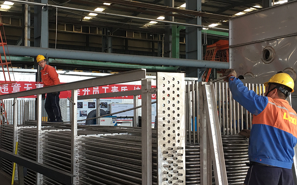 走進(jìn)第一工程事業(yè)部設(shè)備制作廠房,陳興勛主任正在現(xiàn)場指導(dǎo)蒸發(fā)冷管束組對工作,他告訴記者:“公司接到制作循環(huán)水蒸發(fā)冷的制作任務(wù)后,與技術(shù)人員進(jìn)行辨識,制作循環(huán)水蒸發(fā)冷管束可以利用自行拆解與其他單位拆解退庫的Φ25不銹鋼管,將不銹鋼管進(jìn)行內(nèi)、外拋光兩道工序,確保換熱管見金屬光澤、表面清潔、無污垢后進(jìn)行打壓試驗,挑選合格的管子進(jìn)行齊口、截取、拼接、焊接成所需要的長度,利用校直機(jī)進(jìn)行校直,再利用彎管機(jī)進(jìn)行彎制蒸發(fā)冷所需長度的盤管,打壓合格后利用到循環(huán)水蒸發(fā)冷設(shè)備的制作中?!?