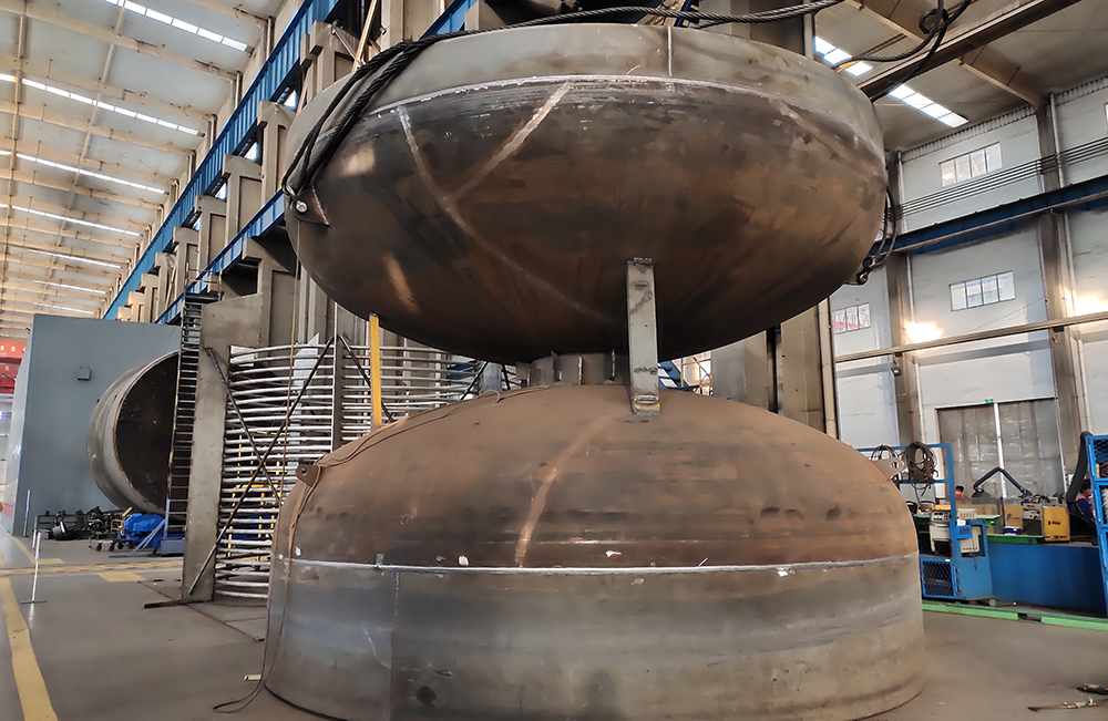 在設(shè)備加工技術(shù)創(chuàng)新方面,制造與工程事業(yè)集團(tuán)技術(shù)人員努力攻關(guān),自制工裝模具配合4000T 壓力機(jī)設(shè)備突破了容器膨脹節(jié)壓制技術(shù)瓶頸,實現(xiàn)容器膨脹節(jié)自制,同時對大直徑分瓣錐節(jié)組裝方式優(yōu)化,節(jié)約了成本,保證了項目設(shè)備需求。項目所需風(fēng)管的組對制作,原工藝流程包括設(shè)備支腿焊接、葉片開孔按圖紙逐臺進(jìn)行劃線定位、焊接、開孔,工作效率較低。技術(shù)人員摸索試驗了新的位置定位方式,使用模板對支腿、擋板位置進(jìn)行劃線,工作效率提高了3 倍。