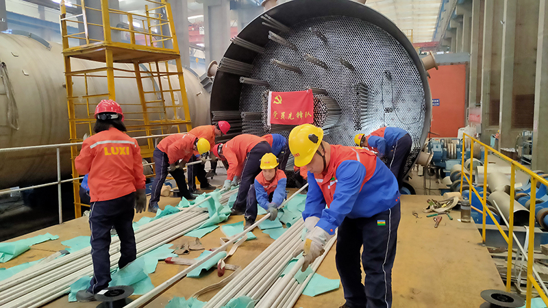 第三工程事業(yè)部黨支部組織開(kāi)展“學(xué)黨史 悟思想”知識(shí)競(jìng)賽和“學(xué)黨史 憶先烈 重溫紅色記憶 ”主題黨日活動(dòng);黨員干部組成突擊隊(duì)和先鋒隊(duì)積極參與車間換熱設(shè)備穿管工作。第三工程事業(yè)部承接的管式反應(yīng)器外銷設(shè)備,需要穿管8500余根直徑32毫米,長(zhǎng)12米的換熱管。由于工期緊,任務(wù)重,設(shè)備結(jié)構(gòu)復(fù)雜,事業(yè)部黨支部號(hào)召大家學(xué)黨史見(jiàn)行動(dòng),以昂揚(yáng)奮進(jìn)的姿態(tài)投入到穿管工作之中。16名黨員發(fā)揮模范先鋒作用,不怕臟不怕累,心往一處使,勁往一處用,僅用5天的時(shí)間就完成了穿管任務(wù),為后期組對(duì)管板奠定了基礎(chǔ)。
