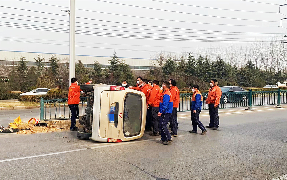 12月20日,魯西集團(tuán)下屬單位第七工程事業(yè)部門口就發(fā)生一樁驚悚而又讓人感動(dòng)的事件。此時(shí)臨近中午,正值員工就餐時(shí)間,只聽“咣”的一聲巨響,一輛面包車疾馳撞向了道路隔離墩,車輛瞬間發(fā)生側(cè)翻。此時(shí)門衛(wèi)執(zhí)勤人員魏慶闊發(fā)現(xiàn)情況后,第一時(shí)間召集了準(zhǔn)備就餐的干部、員工十余人趕赴車禍現(xiàn)場(chǎng),迅速打開主駕駛車門,此時(shí)司機(jī)因受到驚嚇還未緩過神來,身體被安全帶和車座卡住,前來營救的員工協(xié)助司機(jī)解除障礙,并確認(rèn)司機(jī)意識(shí)和身體狀況后,及時(shí)將司機(jī)從側(cè)翻車輛內(nèi)救出。此時(shí)正值中午下班高峰期,如果當(dāng)時(shí)不能及時(shí)將司機(jī)救出,一旦發(fā)生其他車輛追尾,將釀成更加嚴(yán)重的后果。事后司機(jī)對(duì)公司見義勇為的行為既感動(dòng)又感謝,并向參與救援的魯西員工深深地鞠躬致謝。