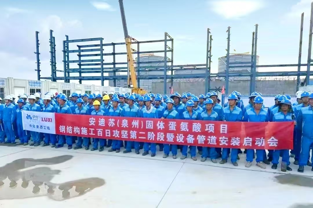中化魯西工程承建的安迪蘇(泉州)蛋氨酸項(xiàng)目現(xiàn)場(chǎng),隆重舉行"鋼結(jié)構(gòu)安裝第二階段暨設(shè)備管道安裝啟動(dòng)會(huì)"儀式。全體建設(shè)者將以時(shí)不我待的緊迫感、精益求精的專業(yè)態(tài)度和勇?lián)厝蔚氖姑校木哿?,攻?jiān)克難,堅(jiān)決打贏鋼結(jié)構(gòu)安裝收官戰(zhàn),高效推進(jìn)設(shè)備管道安裝新戰(zhàn)役,確保項(xiàng)目整體建設(shè)進(jìn)度目標(biāo)按期完成。