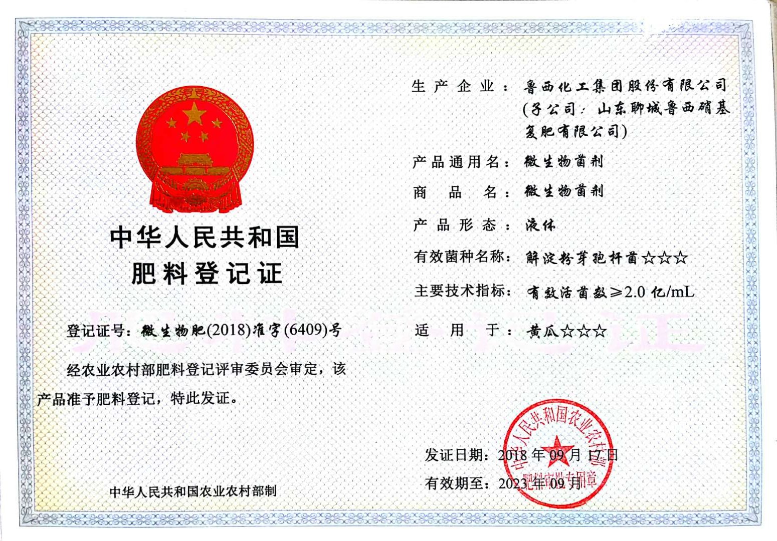10月7日,收到了農(nóng)業(yè)農(nóng)村部肥料評審登記管理處寄來的魯西集團(tuán)農(nóng)業(yè)用微生物菌劑肥料登記證書,共涉及兩個(gè)菌種:解淀粉芽孢桿菌、多粘類芽孢桿菌。登記證號(hào)分別為“微生物肥(2018)準(zhǔn)字(6409)號(hào)”、“微生物肥(2018)準(zhǔn)字(6410)號(hào)”。登記證有效期至2023年9月。